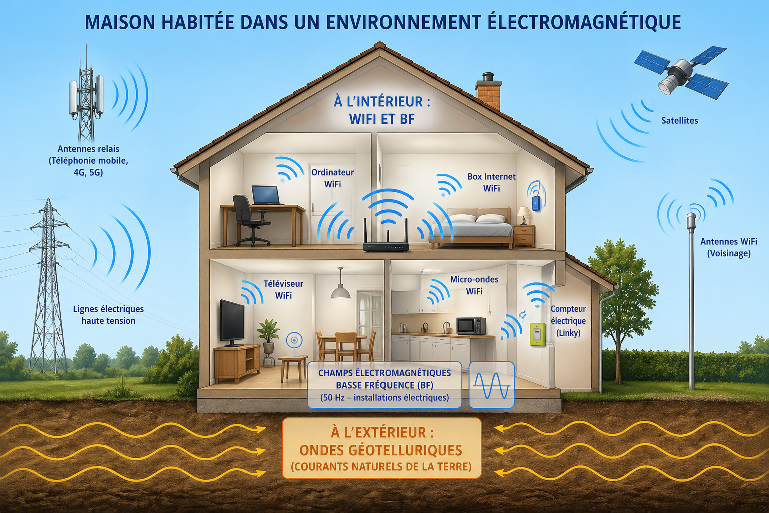 Nous recevons, en permanence, des agressions de champs électromagnétiques dits « artificiels » qui proviennent des antennes relais des opérateurs de la téléphonie mobile, des lignes électriques à haute tension, des moteurs et radiateurs électriques, des panneaux photovoltaïques, de la climatisation. Mais également des téléphones mobiles, du Wifi, du Bluetooth, des appareils électroménagers, …